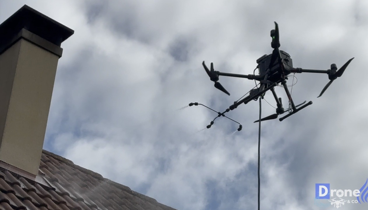 Nous déployons un drone équipé d’un système de pulvérisation haute précision pour un nettoyage de toiture efficace et écologique.
