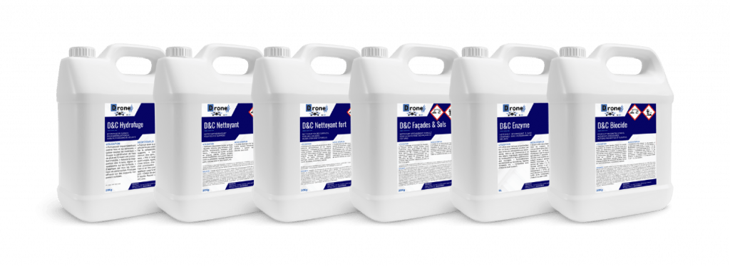 Découvrez toutes nos solutions DnX, fabriquées et formulées en France, qui pourront être utilisées lors de nos prestations. Tous ces produits ont été spécialement développés pour DronatorX et optimisés pour une pulvérisation par drone. Ils répondent à tous les besoins autour du nettoyage et de l’entretien des façades et toitures (action anti-lichen, anti-pollution, hydrofuge…)